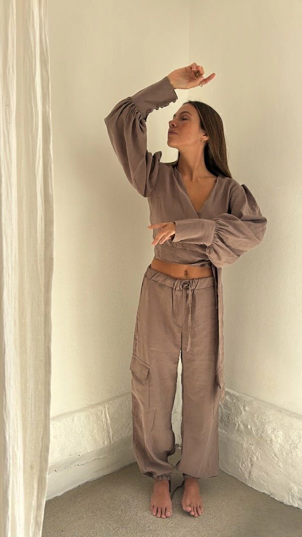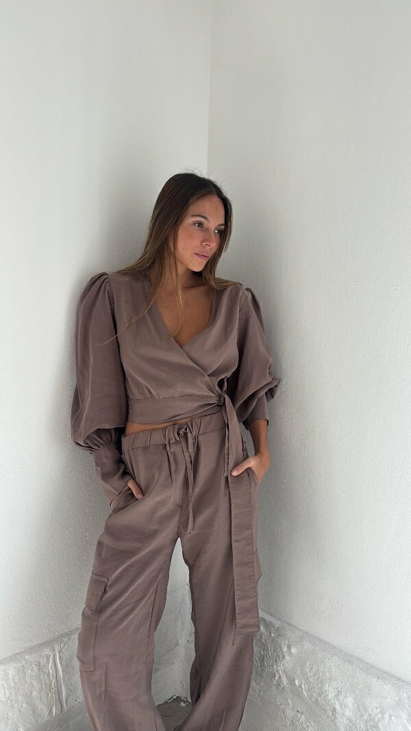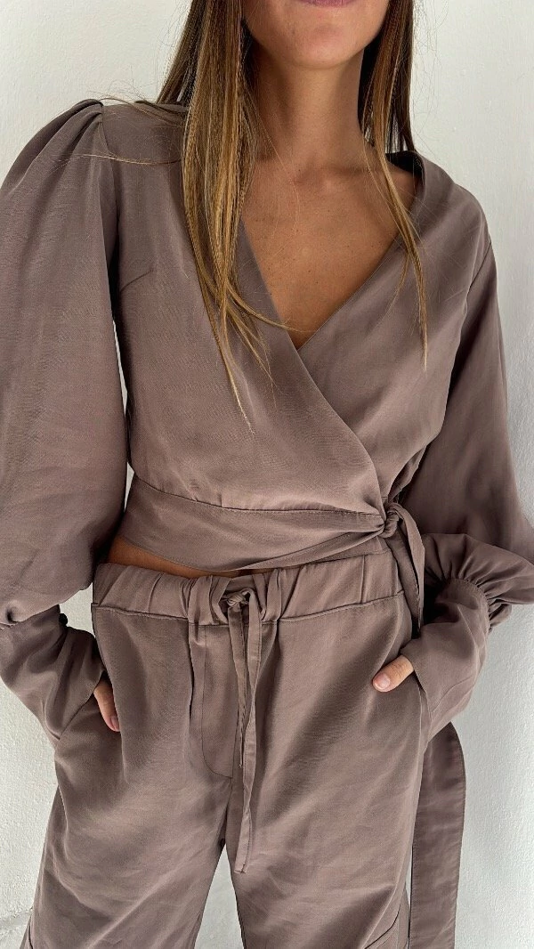 DESCRIPCION: Blusa cruzada con botones internos y lazo para ajustar en cintura baja. Mangas con hombreras, con volumen y puños anchos ajustados con botoncitos coco.