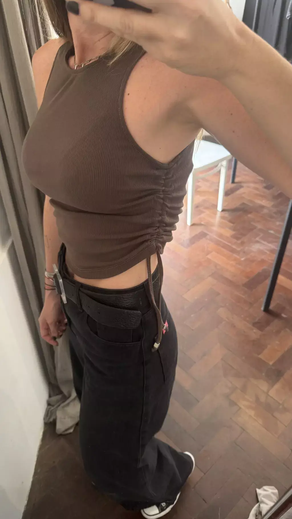 Musculosa de Morley gruesito, tiene en uno de los laterales para fruncir a gusto. Con terminales metálicas.